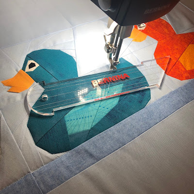 und dann habe ich relativ einfach - nur mit einem Wellenmuster und einmal um jede Ente herum - gequiltet. Ich mag es bei Babyquilts nicht, wenn sie so eng gequiltet sind. Sie sollen ja ein bisschen "fluffig" bleiben...